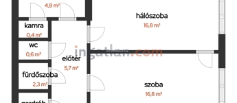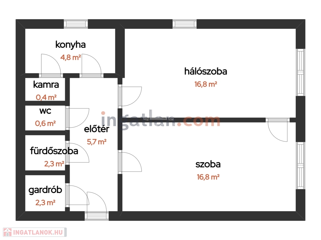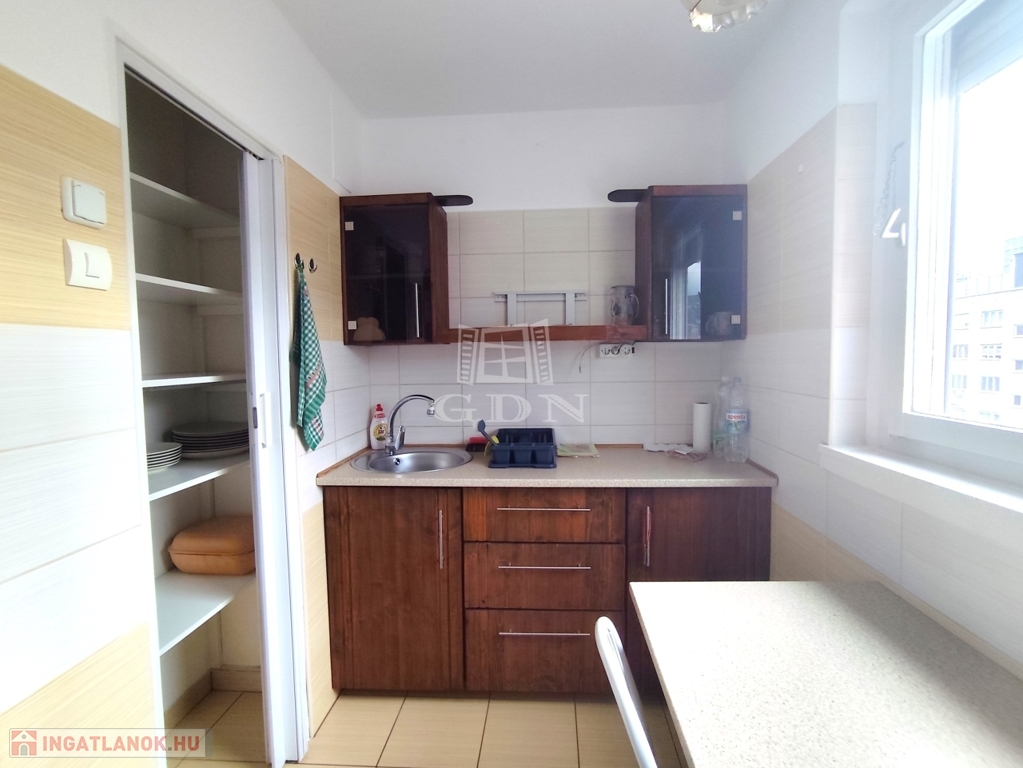 2 különnyíló, 16 m²-es szoba – ideális pároknak, lakótársaknak vagy kisebb családnak. Gépesített konyha, mellette elhúzható ajtós kamra.