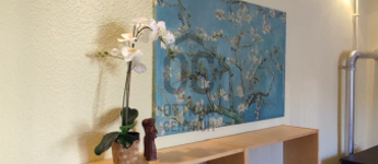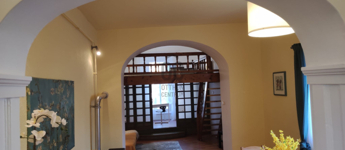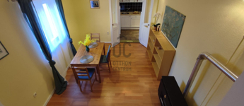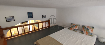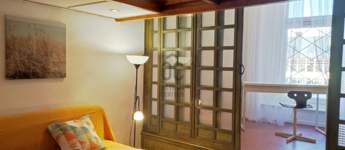 A lakás különleges elosztásának köszönhetően rendkívül napfényes. Az ablakok két ház közötti, fás, csendes zöld udvar felé nyílnak így a nyugalmat nem zavarja a forgalom zaja.A teret egy galériával bővítették ahol a háló kapott helyet. A nyári meleget mobilklíma teszi elviselhetővé.
