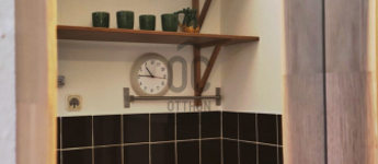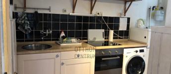 A modern konyha technikailag teljesen felszerelt, még egy kis tároló s tartozik hozzá.
