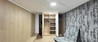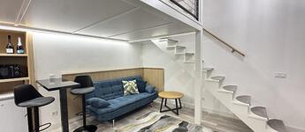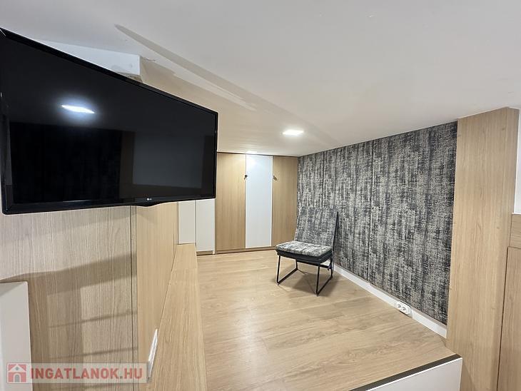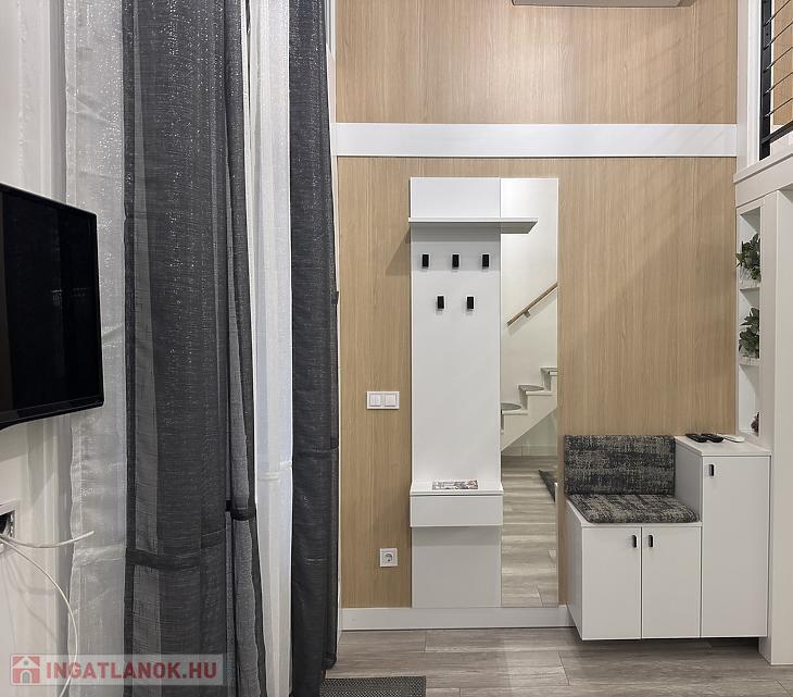 A galérián beépített szekrények biztosítanak bőséges tárolóhelyet, a fürdőszoba zuhanyzós kialakítású.