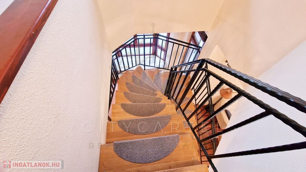 A magánúton megközelíthető lakás földszintjén nagy nappali cserépkályhával, gyönyörű étkezős konyha, tárolós WC helyezkedik el. A konyha gépesített. A nappali felől a 80 nm-es, lakáshoz tartozó terasz felé van kijárat. Ezt a részt csak a bérlők használják, és egy kis konyhakert is kialakításra került. A középső szinten a lépcsőháznál dolgozói rész, a háló és a lépcsőfeljárónál is egy dolgozónak is használható szoba, egy kádas és egy zuhanyzós fürdő található. Itt szárító és mosógép is helyet kapott. Több szobában beépített szekrény. Fent két klímás szoba.