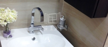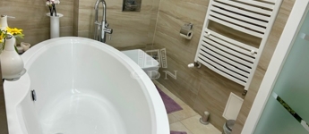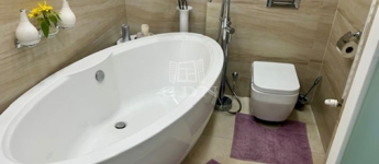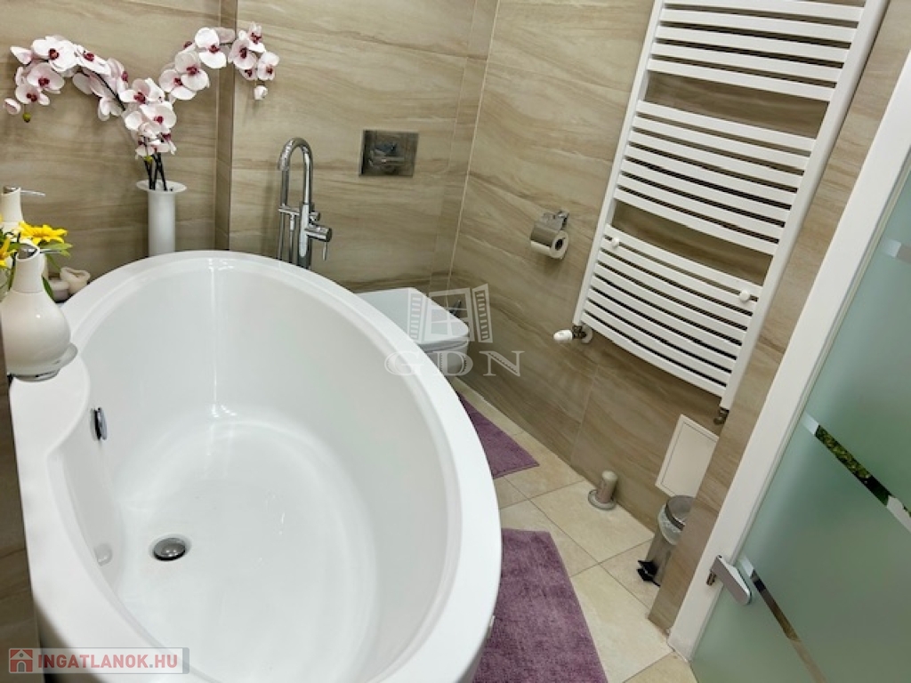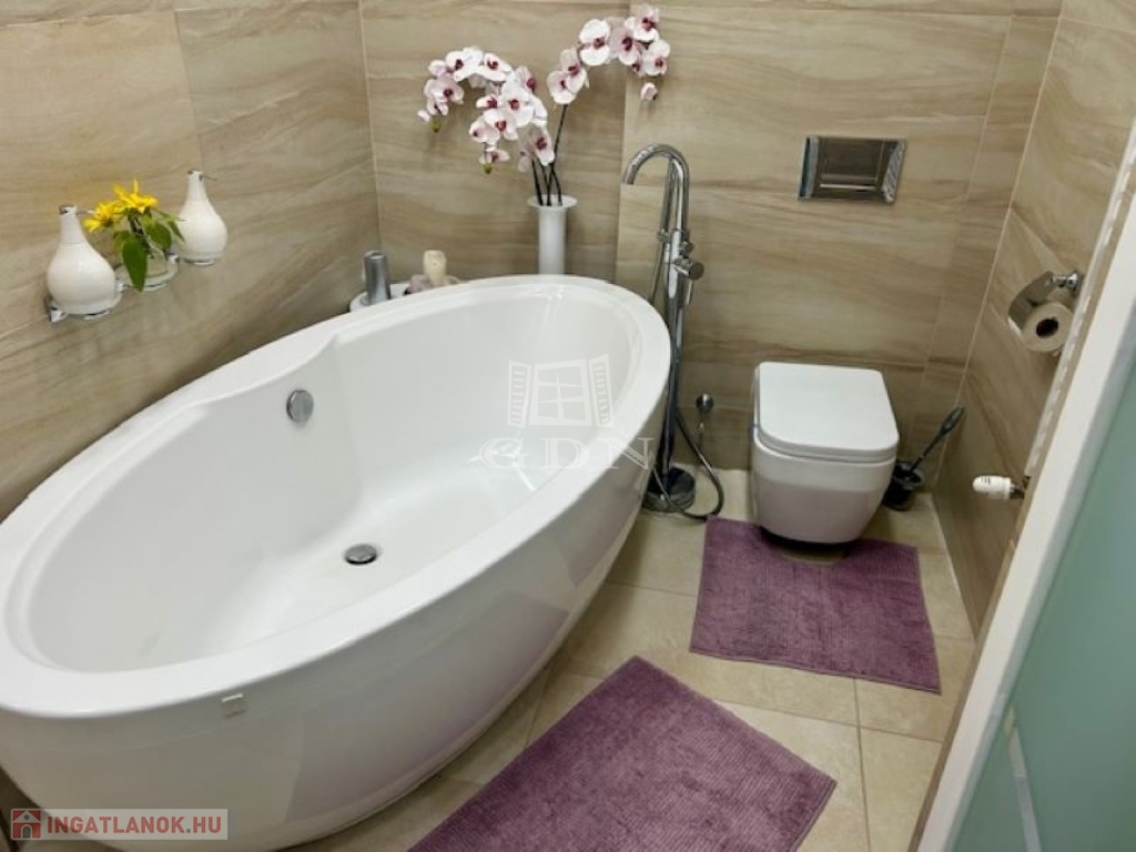 A fürdőszoba igazi különlegesség: hatalmas ovális káddal és különálló szaunával rendelkezik, prémium beépített burkolatokkal és szaniterekkel.
