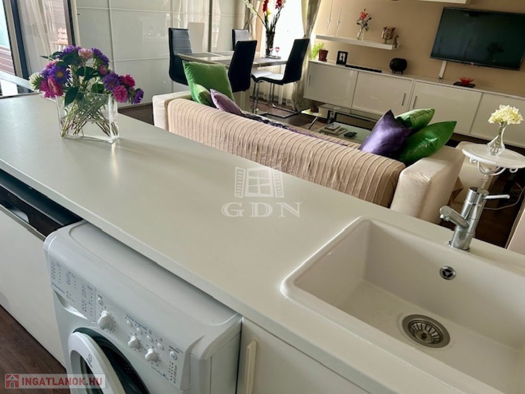 A lakás központi tere egy tágas, amerikai konyhás nappali és étkező (32 m²), amely modern konyhabútorokkal, teljes gépesítéssel és stílusos berendezéssel valamint nagy gardróbszekrénnyel felszerelve várja a lakót.