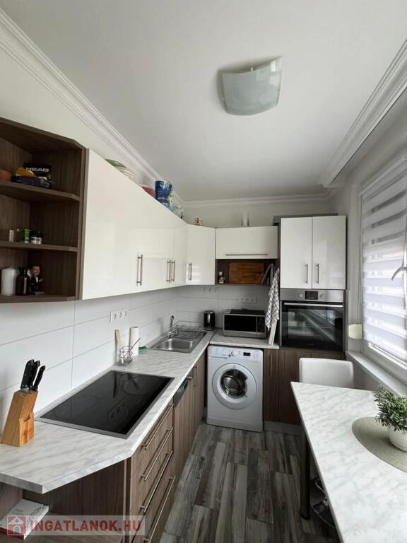 Modern felszereltség: Gépesített konyhabútor, az ablakokon pedig redőny és szúnyogháló gondoskodik a komfortról.