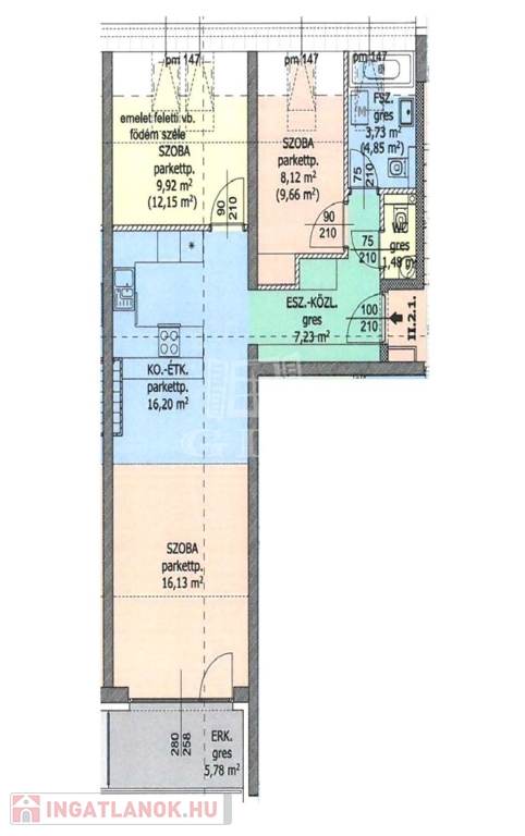 nappali-étkező-konyha 32,33m2, előszoba 7,23m3, szoba 12,15m2, szoba 8,12m2, fürdőszoba 3,73m2, toalett 1,48m2, erkély 5,78m2;