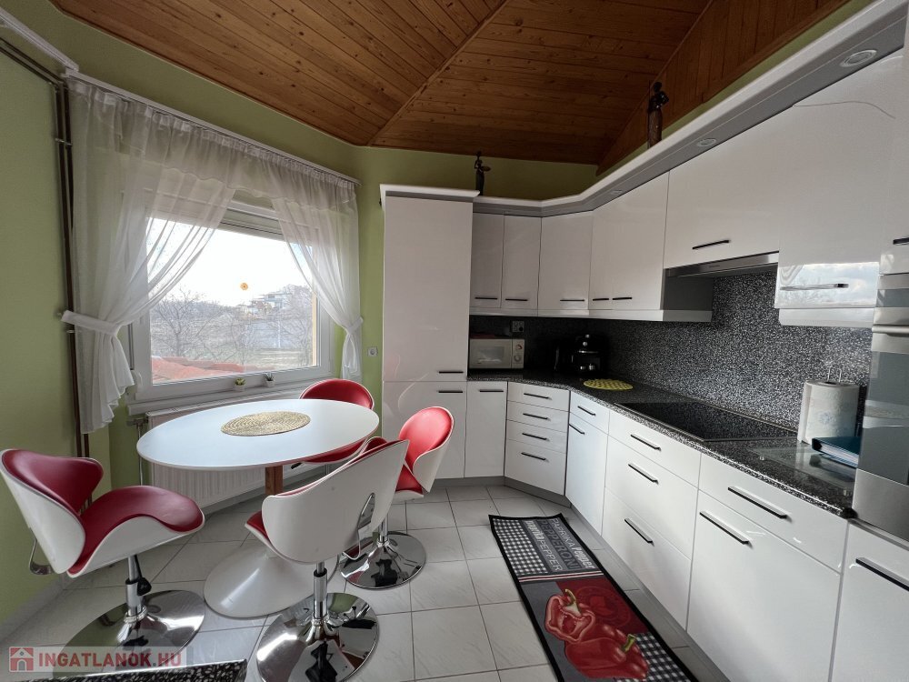 A központi konyha-étkező napfényes és tágas, innen közvetlenül elérhető a délnyugati tájolású, panorámás erkély.