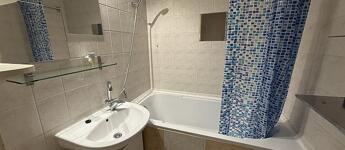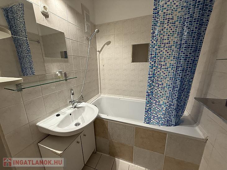 A fürdőszoba új burkolatot kapott, kádas. A mosógép be-és kiállása ebben a helyiségben lett kialakítva.