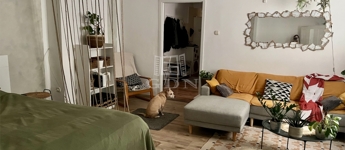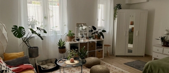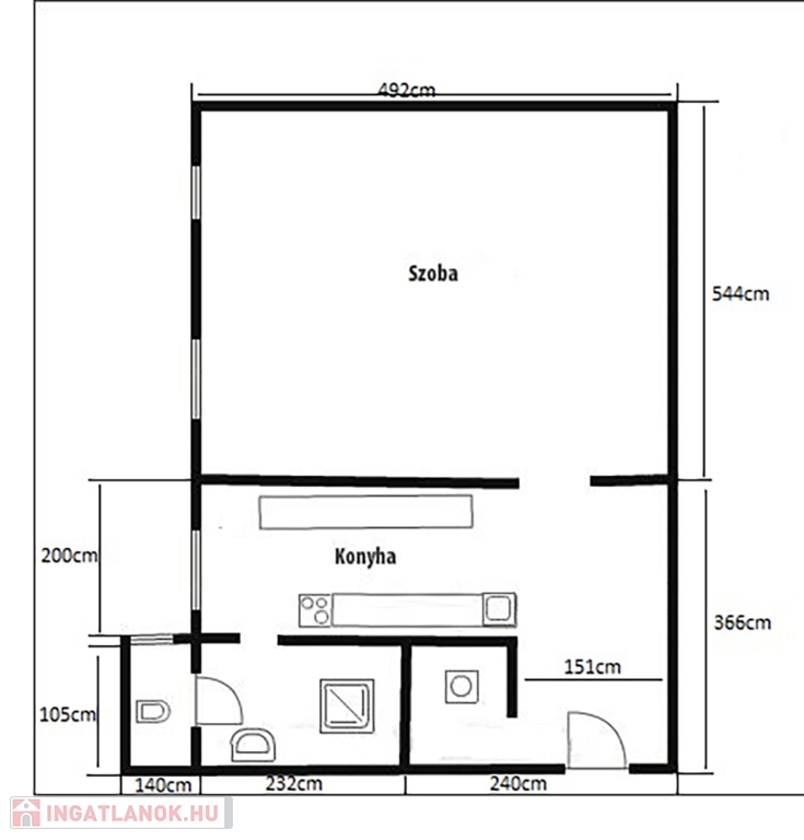 A lakás egy tágas szobából áll, melynek ablakai a kellemes kertre néznek, így garantálva a nyugodt, természetközeli életérzést.