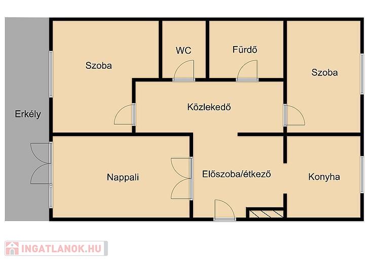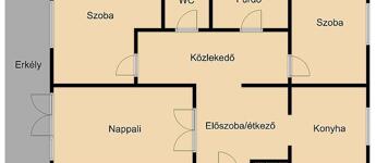 A lakásban található egy nappali, étkező, konyha, kádas fürdő és 2 hálószoba.