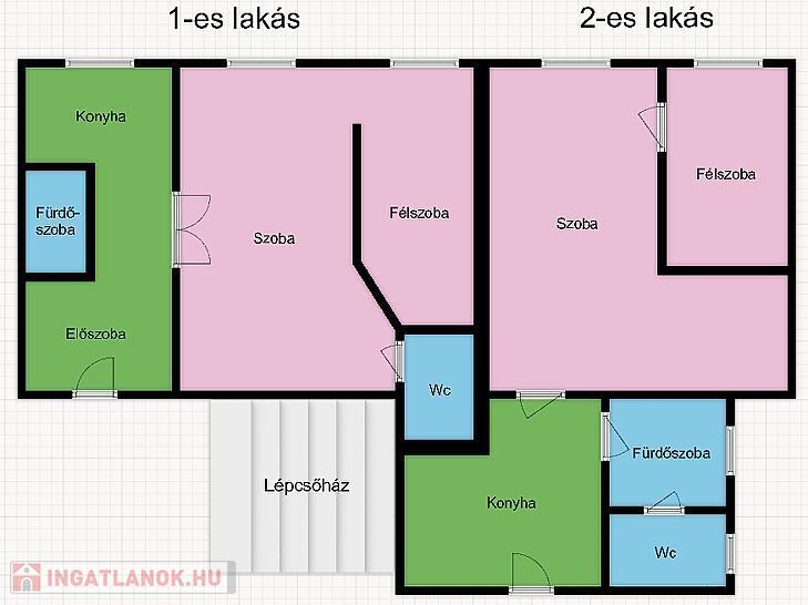 A 2. lakás 42 nm, 1+1 félszoba, konyha, fürdő, wc elrendezésű szintén.