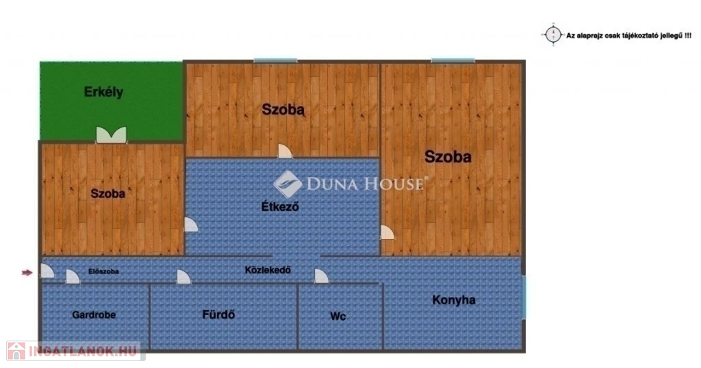 Helyiségei: tágas nappali erkéllyel, két külön nyíló szoba, étkező, ablakos konyha, fürdőszoba, külön WC, gardrób és közlekedő.