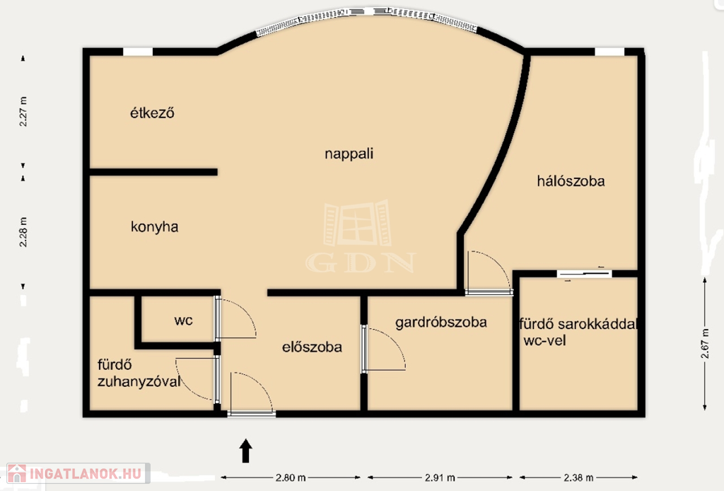 Az előtérből balra nyílik egy zuhanyzós fürdőszoba, mellette külön WC található.