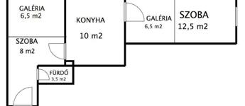 Mindkét szobában 6,5 m2-es galéria lett kialakítva, így növelve a lakóteret. A nagyszoba ablaka utcára néz, a bejárat az udvarról történik.