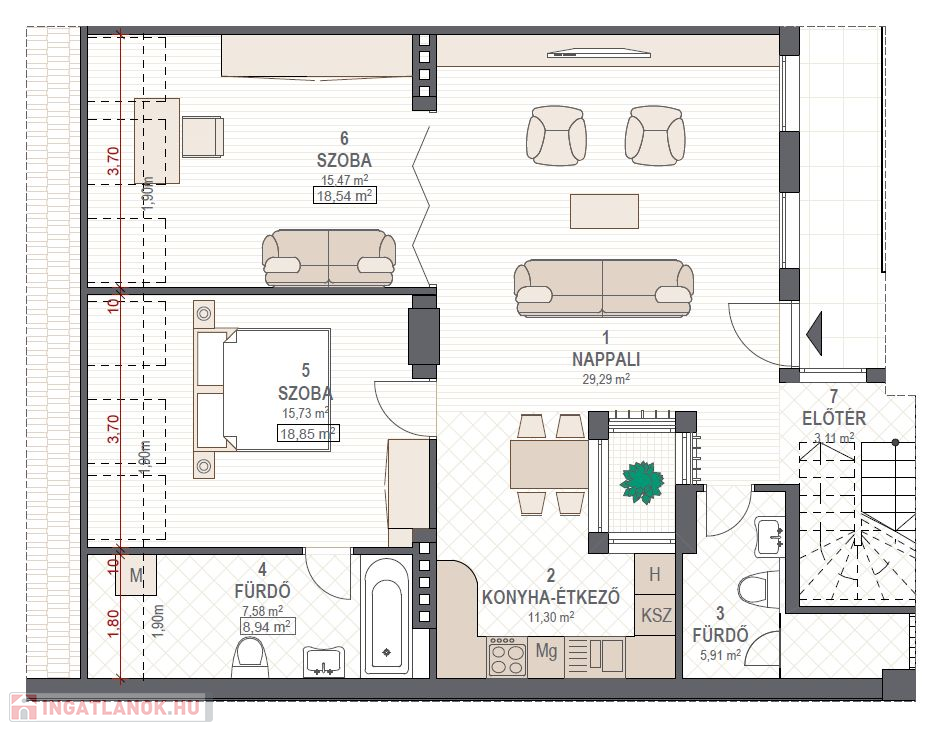 Lakótér: 86 m², amerikai konyhás nappali, 2 hálószoba, 2 fürdőszoba