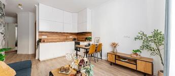A lakásba belépve egy praktikus előszoba fogad, amelyből nyílik az igényesen kialakított fürdőszoba és a világos, amerikai konyhás nappali. Az utcára néző nyílászáróknak köszönhetően a lakás kellemesen napfényes.