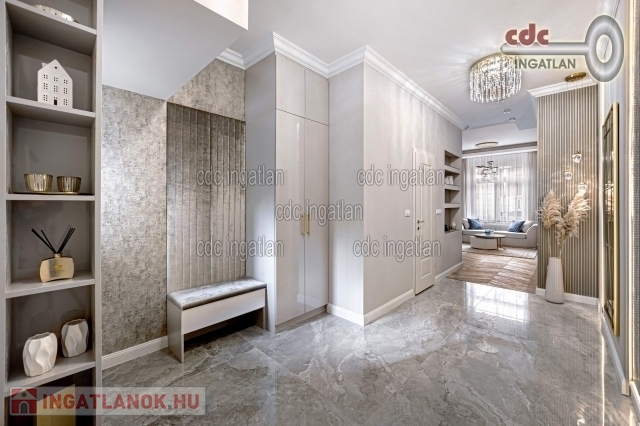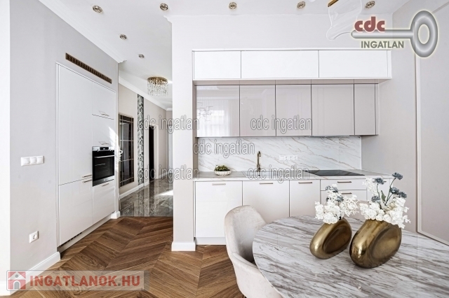 fő hálószobához egy elegáns káddal, WC-vel és bidével felszerelt fürdőszoba kapcsolódik, míg a második szobához egy modern zuhanyzós fürdő. Az ingatlan prémium minőségű bútorokkal és gépekkel együtt eladó, így az új tulajdonos azonnal beköltözhet egy teljesen felszerelt, exkluzív otthonba. A teljes körű felújítás során megtörtént a víz- és villanyvezetékek, valamint a fűtéscsövek, radiátorok cseréje. Designer csillárok, beépített szekrények, minőségi szaniterek és prémium burkolatok kerültek beszerelésre. A 3,30 méteres belmagasság és a chevron mintás tölgyfa parketta különleges, elegáns hangulatot kölcsönöz az otthonnak. A konyha teljesen gépesített, AEG márkájú készülékekkel felszerelt, mosogatógép, hűtő fagyasztóval, sütő, mikró, főzőlap, páraelszívó és mosógép is rendelkezésre áll. A lakás kényelmét két légkondicionáló és automata redőnyök, plusz sötétítők biztosítják. A fűtést házközponti rendszer biztosítja, a közös költség vízzel együtt 53.709.- Ft havonta. A társasház a klasszikus budapesti építészeti stílust képviseli. Az épület az 1900-as évek elején épült, és azóta számos felújításon esett át, megőrizve eredeti báját és eleganciáját. Az ingatlan, a lifttel felszerelt társasház 2. emeletén található a lépcsőházból nyílik a bejárati ajtó. A közvetlen közelben több busz- és villamosvonal elérhető, amelyek gyors és kényelmes kapcsolatot biztosítanak a város többi részével. Ez a lakás nem csak otthonként, hanem befektetésként is tökéletes választás azok számára, akik a belvárosi luxust és kényelmet keresik. Az ingatlan minden részlete a legmagasabb színvonalat