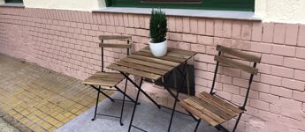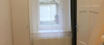 A lakás ablakai egy világos rendezett udvarra néznek.