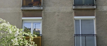 -Nagyszoba ablaka csendes, zöld parkra néz, nincs előtte átmenőforgalom.