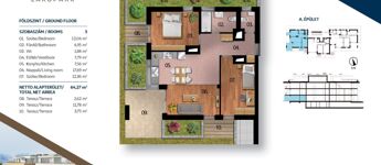 A hirdetésben szereplő lakás a L épület földszintjén található, amerikai konyhás nappali +2 hálószobás elrendezésű.