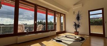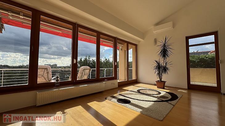 A nappaliból nyílik egy 15 nm-es délnyugati fekvésű, gyönyörű panorámával rendelkező, félig fedett, motoros árnyékolóval ellátott terasz, illetve szintúgy a nappaliból közelíthetjük meg az oldalsó, nyugati fekvésű 5 nm-es, teljesen fedett erkélyt.