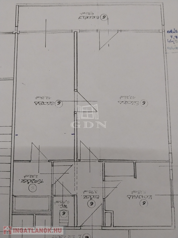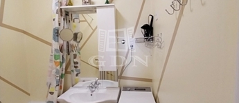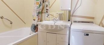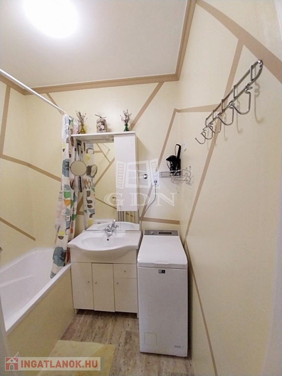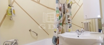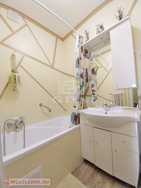 Bal oldalon kapott helyet a külön nyíló tartó szekrénnyel felszerelt 1 nm-es WC, mellette a 3 nm-es kádas újonnan kialakított fürdőszoba.