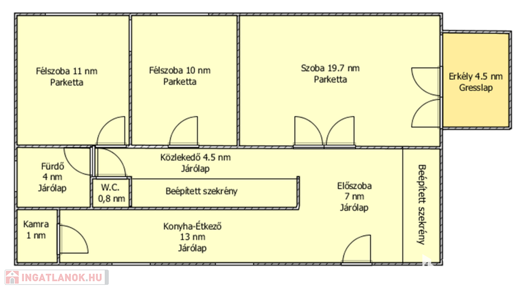 A lakásban nappali, panorámás erkély, 2 külön nyíló hálószoba, fürdőszoba (ablakos), külön nyíló W.C., közlekedő, konyha-étkező (ablakos), kamra, előszoba található.