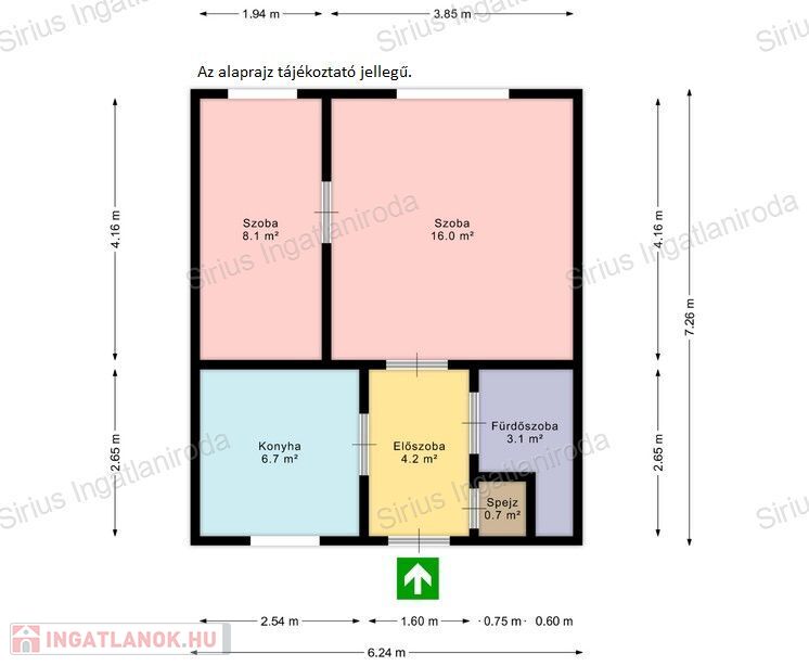 Az ingatlan elosztása jó, konyhája és fürdőszobája ablakos, valamint az előszobából nyílik egy spejz is. A nyílászárók hő és hangszigetelt műanyag nyílászárók.