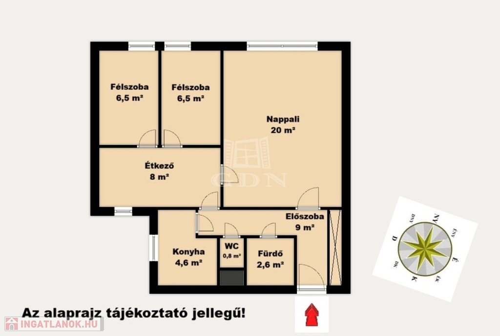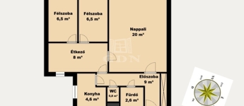 - Szoba: 20 m²; két félszoba: 2 x 6,5 m².