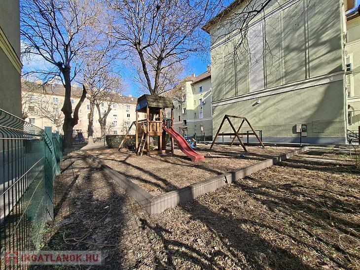 A társasház rendezett, saját, zárt belső kerttel rendelkezik, ahol játszótér és parkolási lehetőség is megtalálható – ideális választás kisgyermekes családoknak vagy akár befektetés céljára is.
