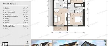 A meghirdetett 1. emeleten található 60,56 nm-es ingatlanban amerikai konyhás nappali, 2 szoba, fürdőszoba, külön WC, gardrób, előtér kerül kialakításra. A nappaliból 4,64 nm-es erkély nyílik.