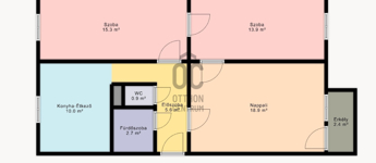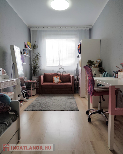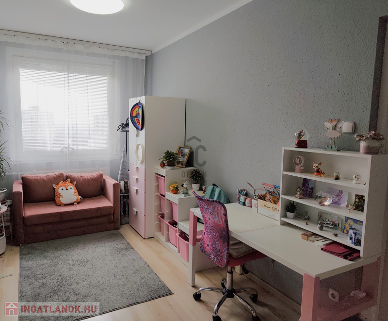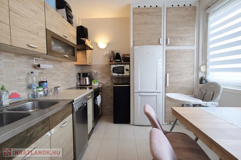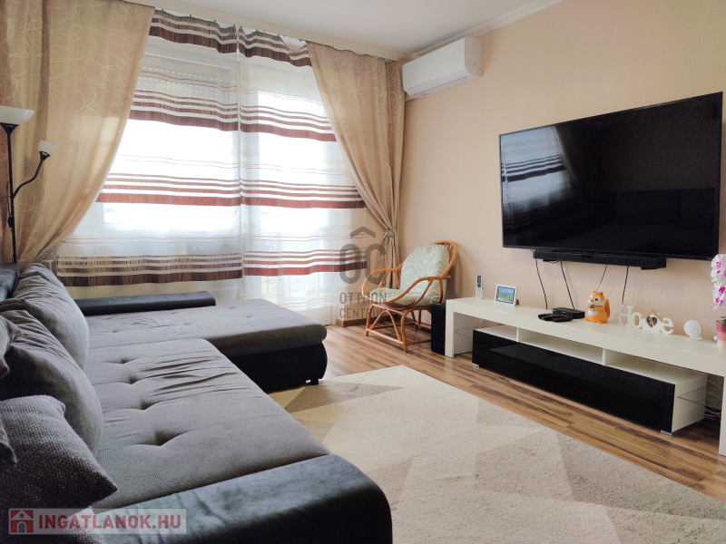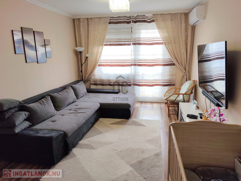 A 68 m²-es, háromszobás ingatlan a társasház nyolcadik emeletén helyezkedik el. A jelenlegi alaprajz körbejárható, a helyiségek egymásból nyílnak, ami tágas térérzetet biztosít. Igény esetén egy könnyűszerkezetes válaszfal elhelyezésével a lakás három külön nyíló szobássá alakítható, és ezzel egyidejűleg gardrób vagy külön tárolóhelyiség is leválasztható. Az előszoba kifejezetten tágas, nagy méretű beépített szekrényekkel, amelyek praktikus tárolási lehetőséget biztosítanak a mindennapokban. A nappali erkélykapcsolatos, amely használható kiegészítő életteret jelent. A konyha-étkező tágas, világos, kialakítása lehetővé teszi, hogy akár többtagú család is kényelmesen le tudjon ülni az asztal köré. A fürdőszoba és a WC külön helyiségben található, mindkettő 2023-ban megújult. Ugyanebben az évben az elektromos hálózat korszerűsítése is megtörtént. A nappaliban klíma került felszerelésre. Az egyik szobában műanyag nyílászáró található, a többi helyiség fa ablakokkal rendelkezik. A fűtés és a meleg víz jelenleg mérés nélküli távhővel működik: a téli hat hónapban a havi költség 23.000 Ft, a nyári hónapokban 8.000 Ft. Az ingatlan tehermentes.