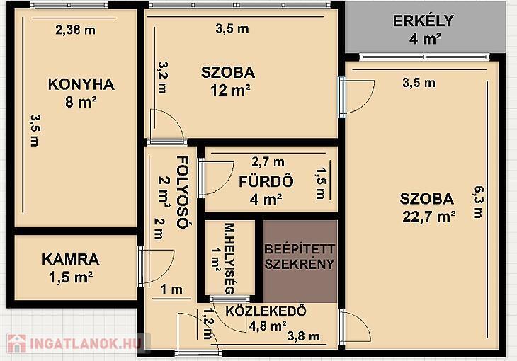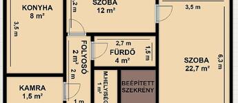 2 szoba, ablakos, étkezős konyha,zuhanyzós fürdőszoba, mellékhelyiség, közlekedő, erkély.