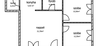 A lakás felosztása: egy amerikai konyhás nappali, 2 hálószoba, egy fürdőszoba mosdóval, és egy spájz.