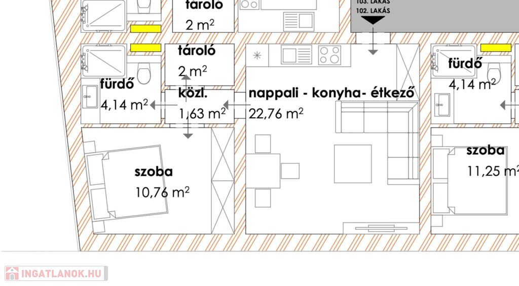 A 1 db amerikai konyhás nappalival, 1db hálószobával, 1 db fürdőszobával, közlekedővel, rendelkezik.