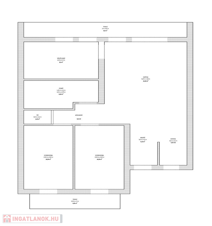 Az ingatlan lakóterülete 72 m2, melyben előszoba, konyha-étkező-nappali, közlekedő, 3 félszoba, fürdőszoba és WC található, valamint 2 db fedett terasz is tartozik a lakáshoz.