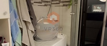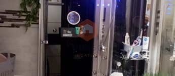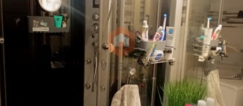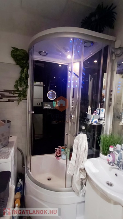 -fürdőszoba, modern mosdókagylóval, zuhanykabinnal.