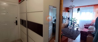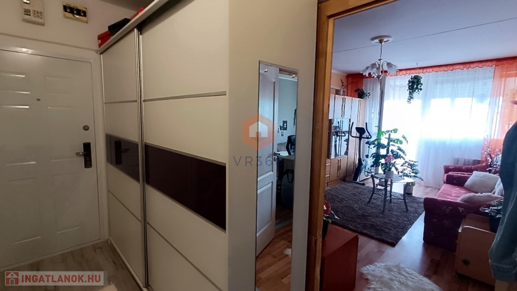 -tágas előszoba, beépített szekrénnyel, tükörrel.