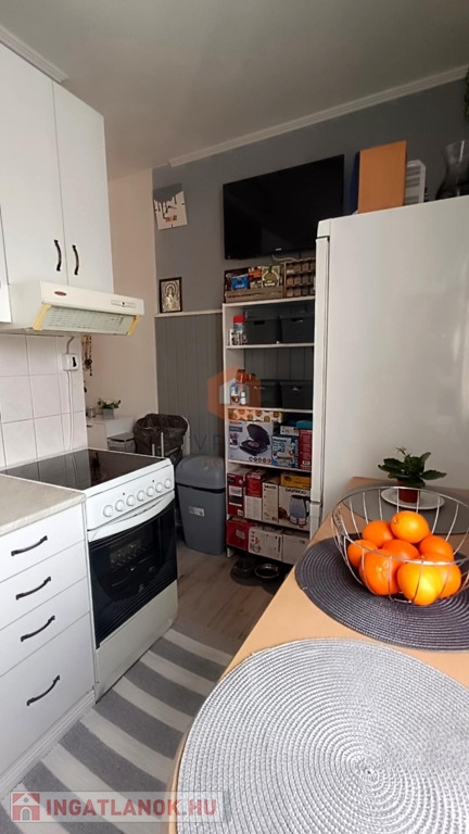-konyha, beépített konyhapulttal, elektromos főzőlappal és sütővel, étkező asztallal.