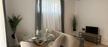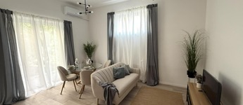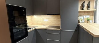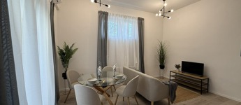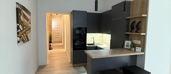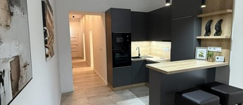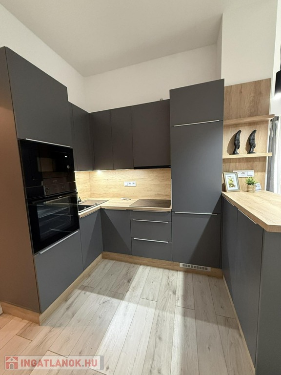 Amerikai konyhás nappali minőségi beépített bútorokkal, gépesítve.