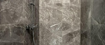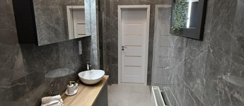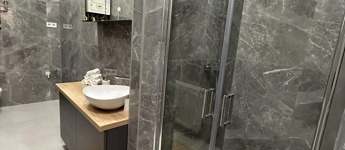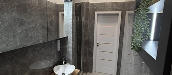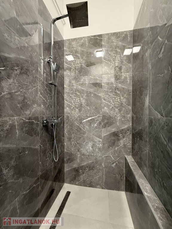 Épített zuhanykabinnal ellátott tágas fürdőszoba