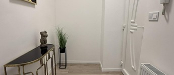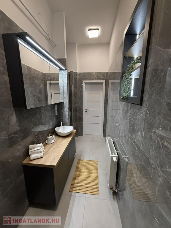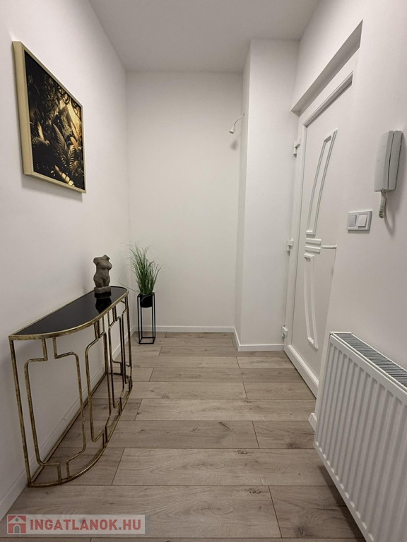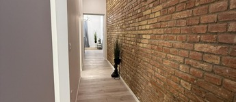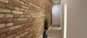 Különlegessége a folyosó teljes fala briliánsan kilátszó téglás, ami egyedi karaktert kölcsönöz a lakásnak.