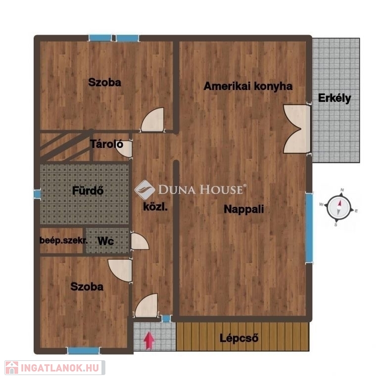 Az ingatlan elosztása amerikai konyha nappali+ 2 szoba, beépített gardróbbal, külön fürdő és wc, 70m2 kizárólagos KERTKAPCSOLAT.