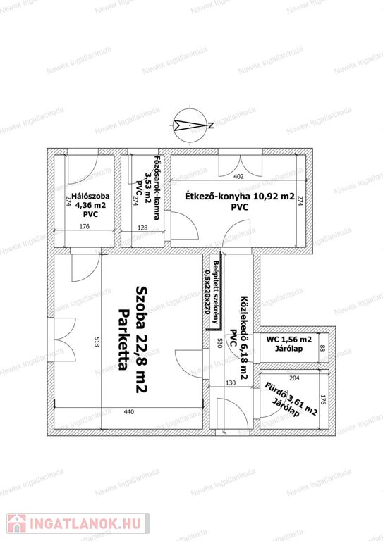 A biztonsági műanyag bejárati ajtón át egy tágas közlekedőbe érkezünk, ahonnan balra nyílik a 22 m²-es nagy szoba, jobbra pedig a fürdő és a wc. A közlekedő végén található a nappali-étkező, amely eredeti funkciója szerint konyhaként szolgált, így a víz- és szennyvíz kiállások továbbra is elérhetők a falsíkon. Innen nyílik a jelenleg konyhasarokként használatos, korábbi kamrahelyiség.