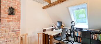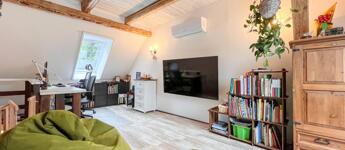 A tetőtér beépítésekor megmaradt az eredeti, karakteres fagerendás födém, amely esztétikai és történeti értéket képvisel.