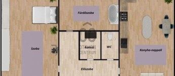 Átalakított alaprajz: a korábbi konyha helyén tágas fürdőszoba kapott helyet, a nappaliban pedig amerikai konyhás kialakítás biztosítja az otthonosságot és a közösségi teret.