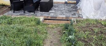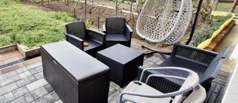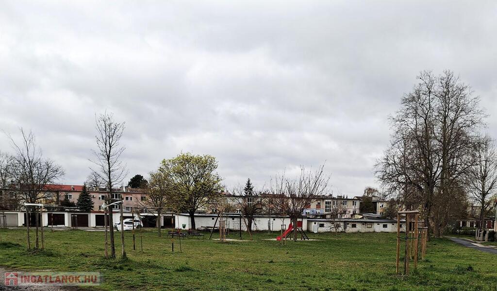 Az ingatlanhoz tartozik egy saját használatú kertrész, amely a teraszról is közvetlenül megközelíthető, valamint egy nagyméretű mobilgarázs, amely kerti tárolóként funkcionál.