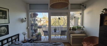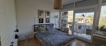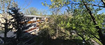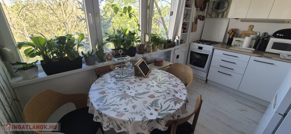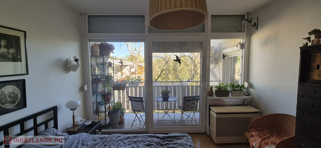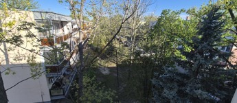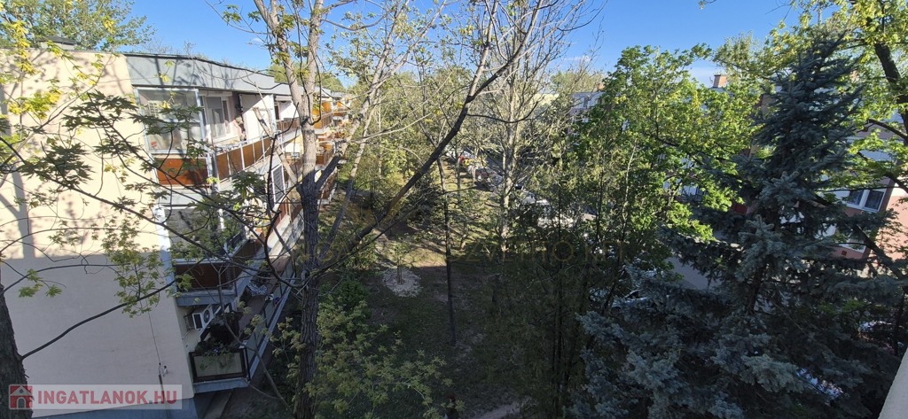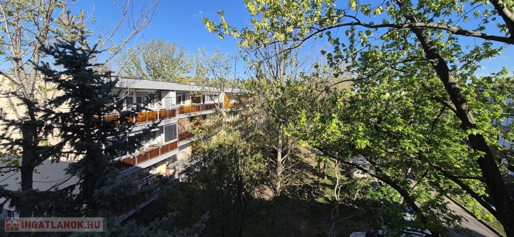 Az erkély parkos, zöld területre néz, így kifejezetten nyugodt, kellemes hangulatú.