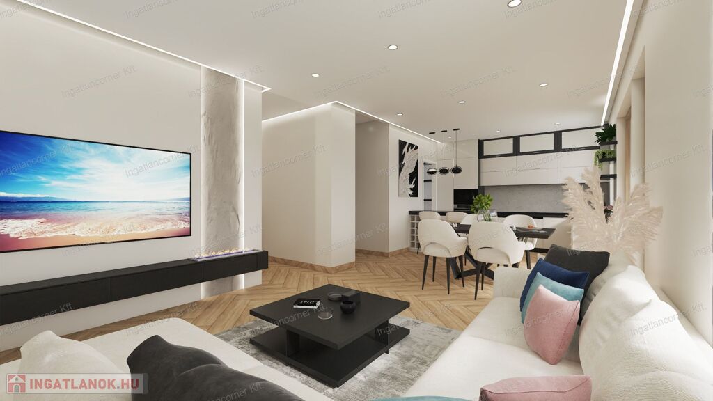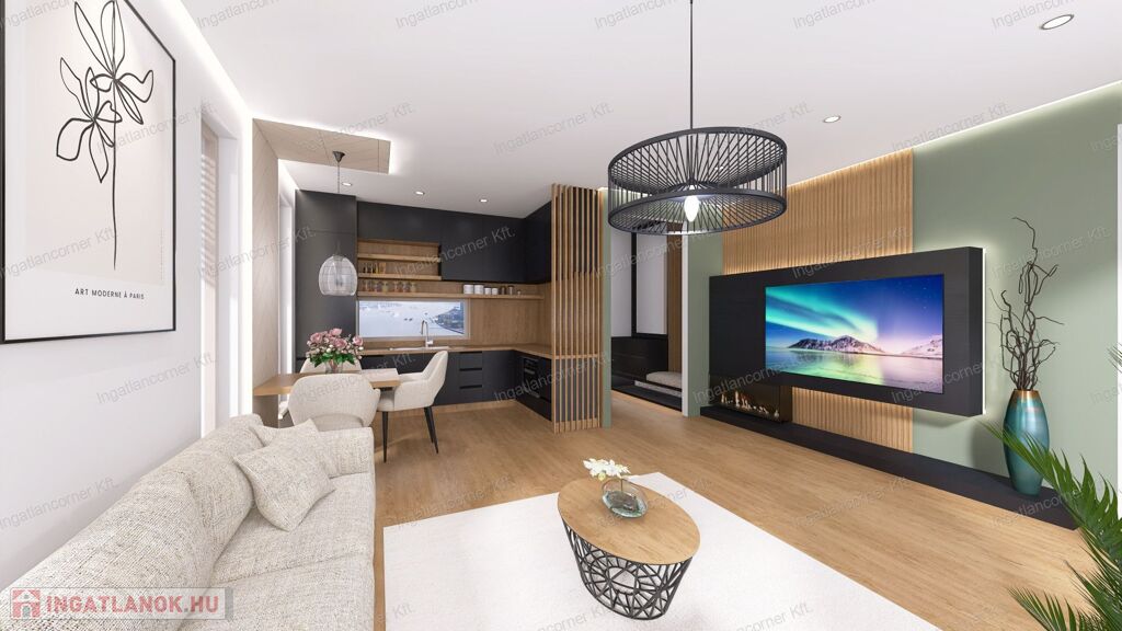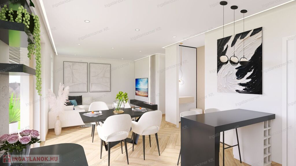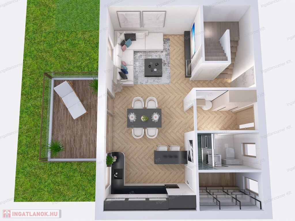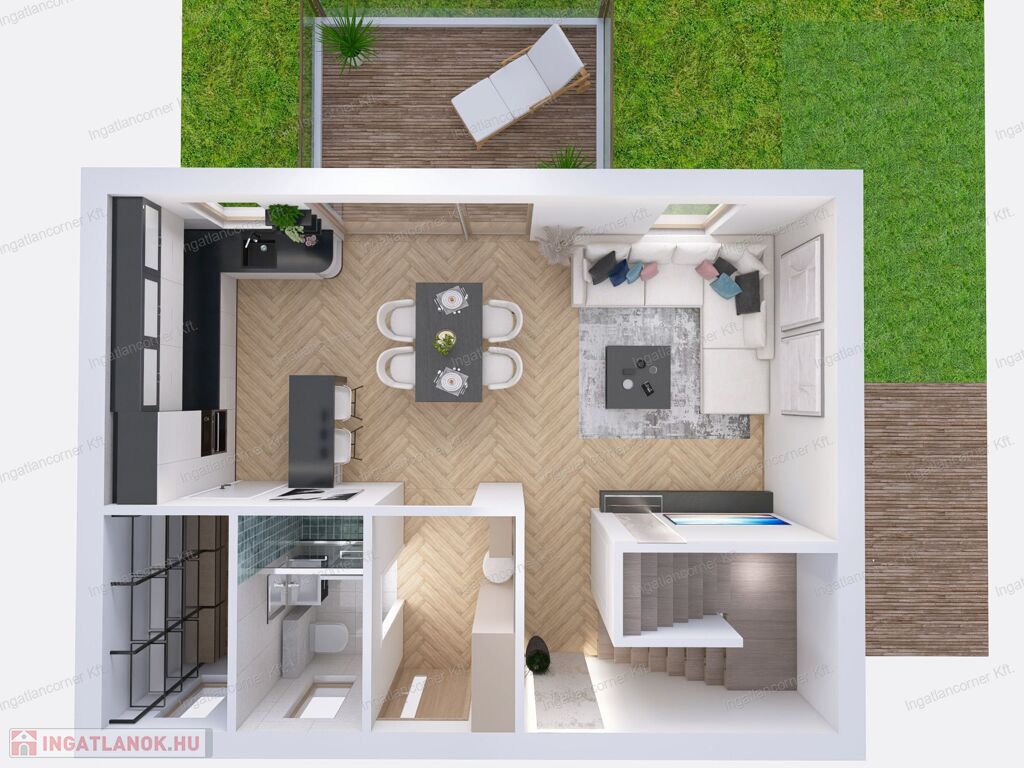 ℹ️ Tájékoztatás: A hirdetésben szereplő látványtervek kizárólag tájékoztató jellegűek, a sok közül egy lehetséges elrendezést és térkihasználási megoldást illusztrálnak. A látványtervek szerzői jogvédelem alatt állnak, azok másolása, módosítása vagy további felhasználása kizárólag a jogtulajdonos engedélyével lehetséges!