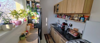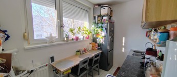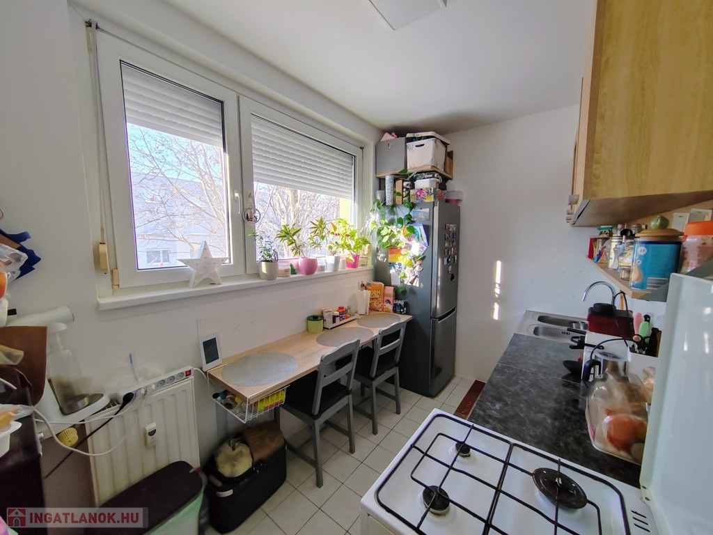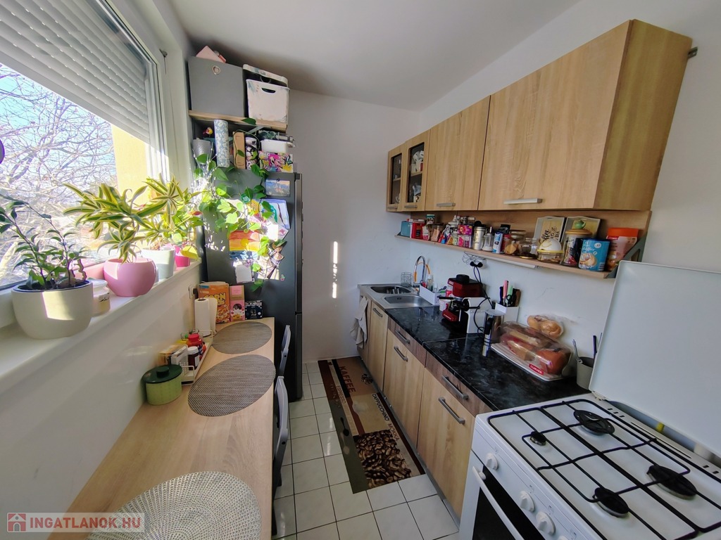 A konyha szép állapotú , keleti fekvése és nagy méretű műanyag nyílászárói által napfényes, a virágok jól érzik magukat ebben a lakrészben.
