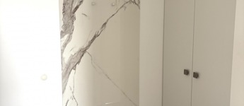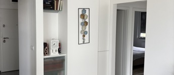 Az egyedi, beépített bútorok letisztult megjelenést kölcsönöznek minden helyiségnek.